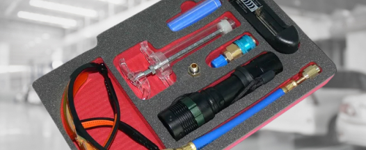В состав набора входит – ультрафиолетовый фонарь с аккумуляторной батареей, шприц для ввода UV красителя и желтые очки для идентификации места утечки газа с помощью ультрафиолетового красителя (опция).