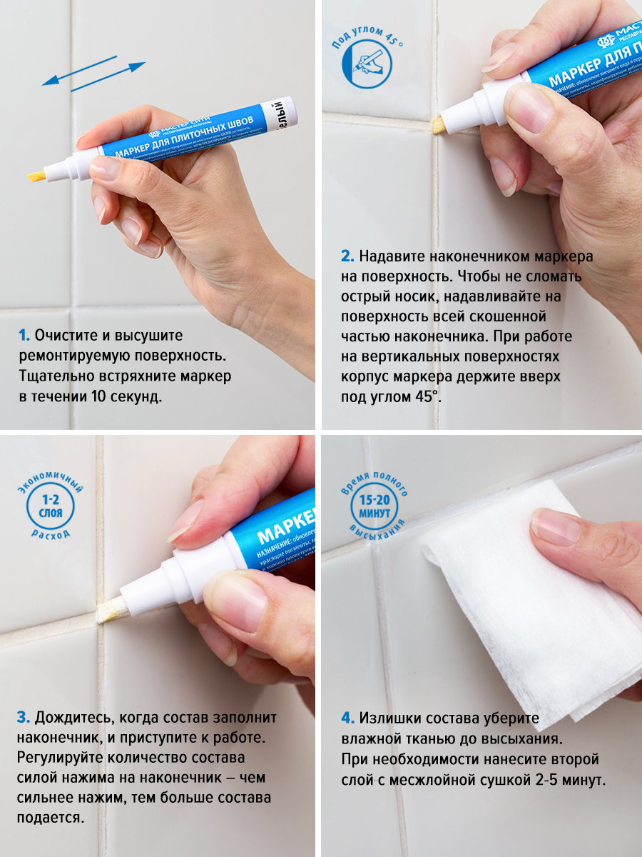 Маркер для плиточных швовпредназначен для обновления внешнего вида и перекрашивания межплиточных швов. Эффективно закрашивает межплиточные швы, возвращает яркость и насыщенность цвета надолго.