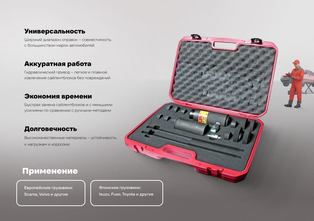 - Прочный переносной кейс, оснащенный транспортировочной рукояткой, специальными замками-защелками и индивидуальной ячейкой под каждый инструмент;