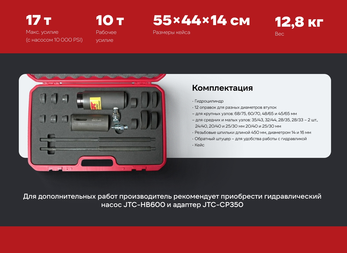 Набор для снятия и установки сайлентблоков и втулок грузовых автомобилей JTC с гидравлическим приводом, максимальное усилие 17т; рабочее 10т JTC-4115 активно применяется на станциях сервисного и технического обслуживания грузового транспорта. С помощью данного комплекта автомеханик быстро и аккуратно осуществит монтаж/демонтаж требуемого крепления, исключая вероятность повреждения гаек, болтов и других слабо нагруженных деталей автомобиля. Инструменты предназначены для совместного использования с гидравлическим насосом JTC HB600 (поставляется отдельно). Максимальное возможное прикладное усилие - 17 т.