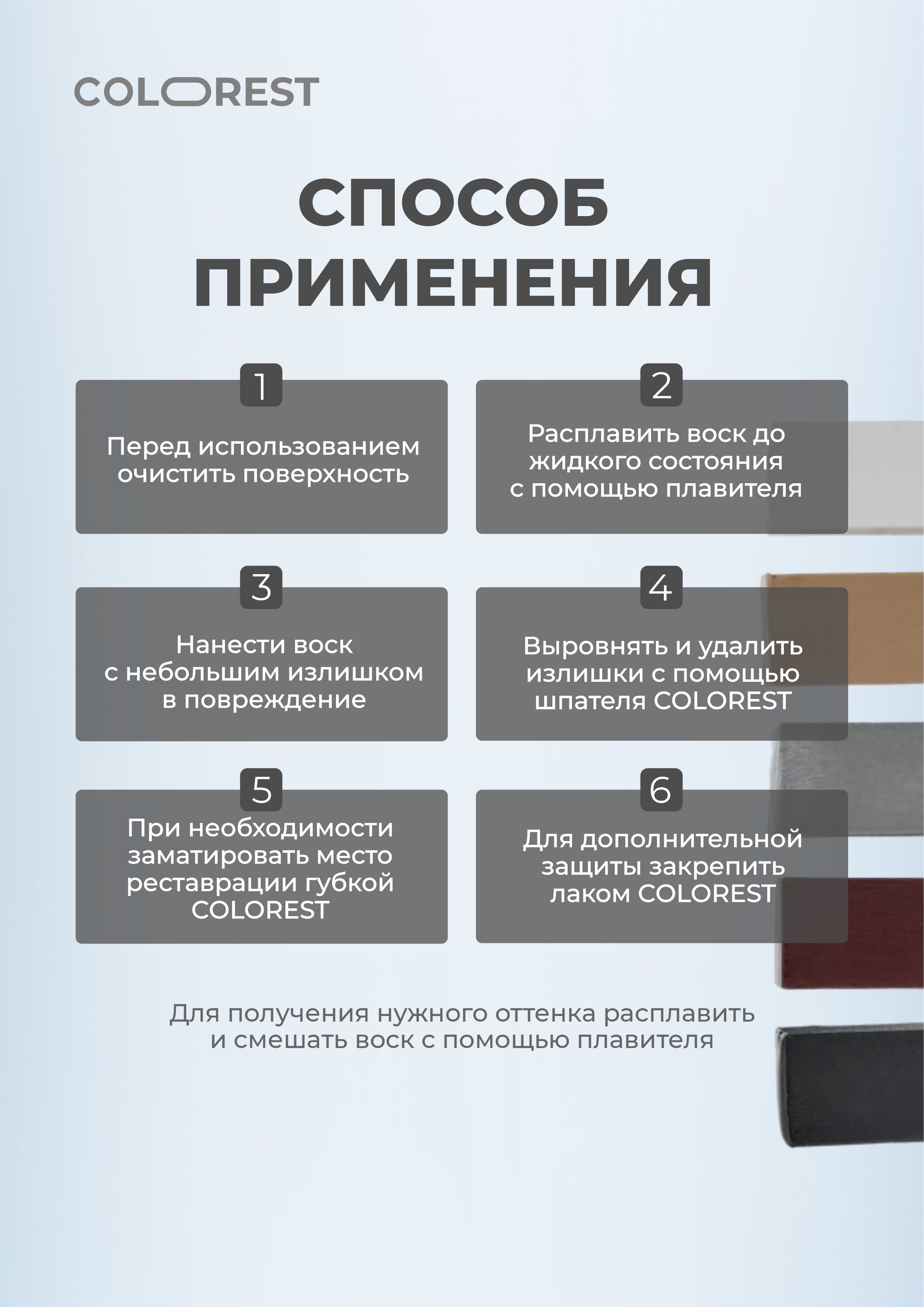 Твердый воск 10 наиболее популярных оттенков. Для работы нужен плавитель. Воск для реставрации идеально подходит для мебели, столешниц, окон, дверей, напольных покрытий.