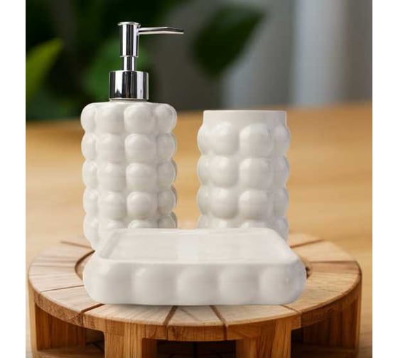 Набор аксессуаров для ванной состоит из 3-х предметов – мыльницы, диспенсера для жидкого мыла и стакана для зубных щеток. Аксессуары отличаются лаконичным дизайном и узором. Набор предметов для ванной поможет создать атмосферу уюта и организовать пространство вашего дома. Аксессуары изготовлены из прочной керамики, устойчивы к перепадам температуры и высокой влажности.