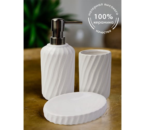 Набор аксессуаров для ванной состоит из 3-х предметов – мыльницы, диспенсера для жидкого мыла и стакана для зубных щеток. Аксессуары отличаются лаконичным дизайном и узором. Набор предметов для ванной поможет создать атмосферу уюта и организовать пространство вашего дома. Аксессуары изготовлены из прочной керамики, устойчивы к перепадам температуры и высокой влажности.