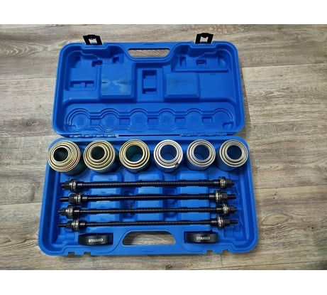 Набор для замены сайлентблоков Станкоимпорт ST030303 применяется для демонтажа и установки сайлентблоков, а также подшипников. Простая и надёжная конструкция. Наличие подшипников в упорных шайбах обеспечивает удобство работы.