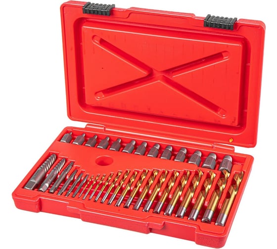 Профессиональный набор инструментов для извлечения сломанных, сорванных или заржавевших болтов, винтов, шпилек, а также для удаления поврежденных гаек. Комплект включает спиральные (витые) и стержневые (клиновидные) экстракторы, а также набор сверл для подготовки отверстий.