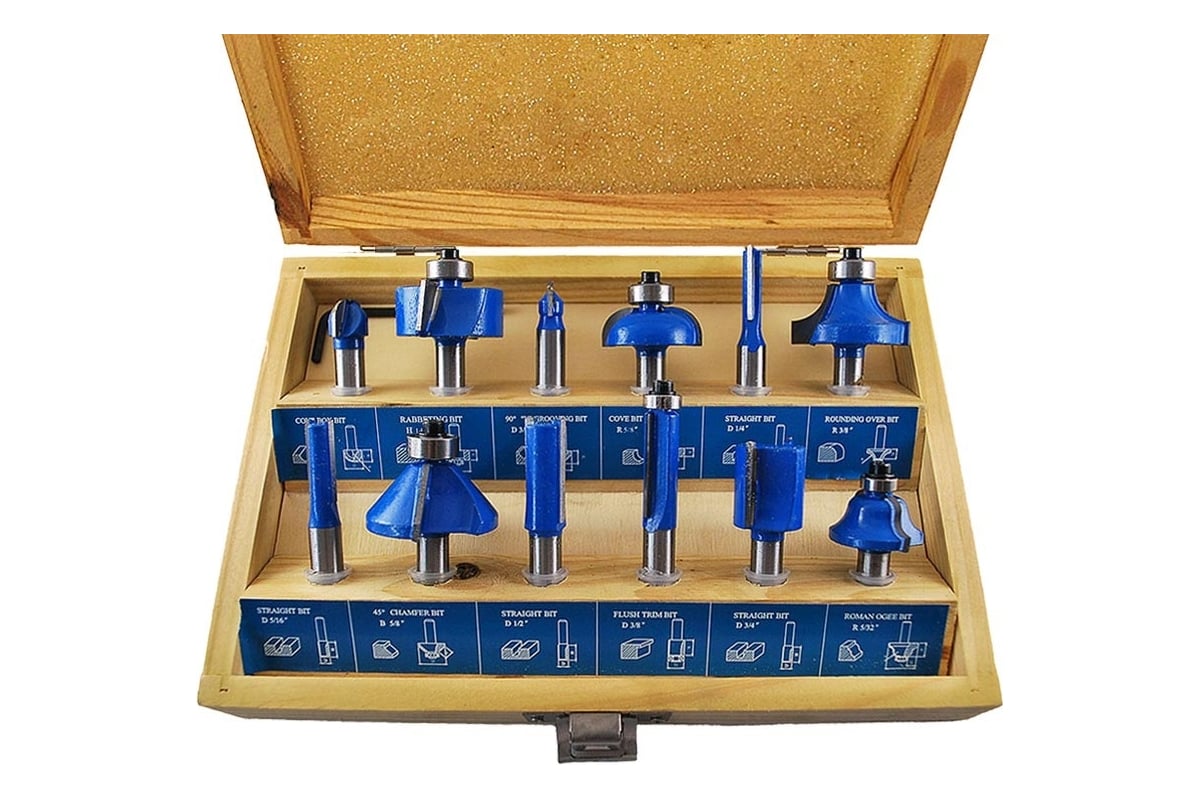 В набор входит 12 фигурных фрез, с помощью которых можно выполнять различные операции, например, выемку пазов, обработку кромок и окантовку. Набор является универсальным, так как фрезы подобраны разных размеров и разных типов.