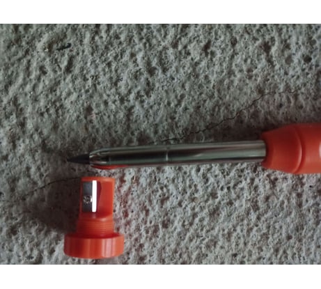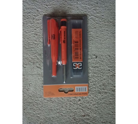 Карандаш с запасными грифилями и точилкой на карандаше, а не в чехле. Точилка прикручена плохо и надо подтянуть. Пластик токоват и можно легко раздавить, встав на него. Карандаш имеет яркий цвет, так что легко найти в куче строительных вещей.