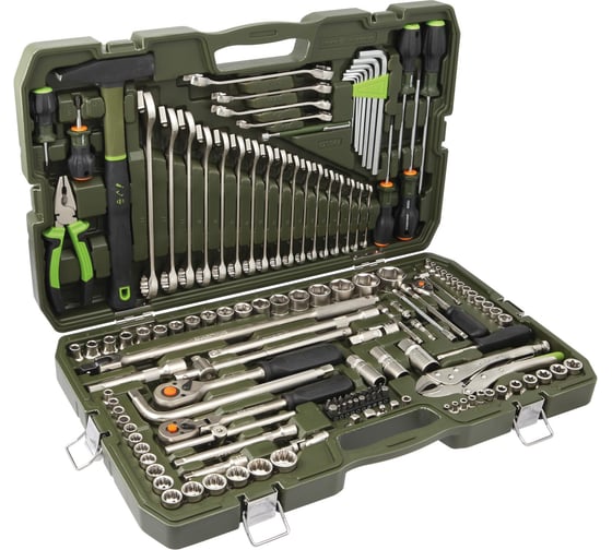 Набор включает в себя инструмент с присоединительным квадратом на 1/4”, 3/8”, 1/2”, что обеспечивает взаимозаменяемость головок и приводов любого из профилей. Таким образом увеличивается количество возможных вариантов подбора требуемой головки с учётом расположения крепежа и выбора привода необходимого размера. Набор инструментов 147 предметов в чемодане подходит для ремонта автомобиля, мотоцикла и другой техники в гараже, мастерской, поездке или автопутешествии.