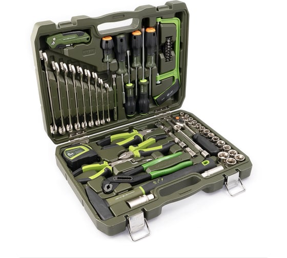 Благодаря наличию в комплектации головок, ключей и слесарного вспомогательного инструмента набор 610 766 подходит для выполнения широкого спектра слесарных и бытовых работ.