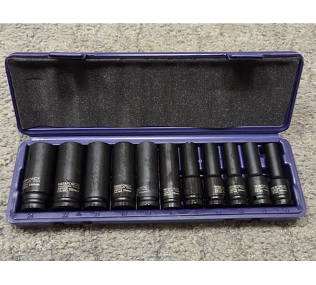 В комплект входят ударные шестигранные глубокие головки следующих размеров: 10, 11, 12, 13, 14, 15, 17, 19, 21, 22, 24 мм.