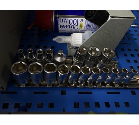 Планка для хранения позволяет легко организовать рабочее место, предотвращая потерю головок. Также можно использовать планку для удобного транспортирования набора.