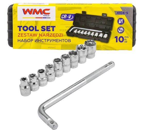 Набор головок торцевых 6-гранных с Г-образным воротком WMC TOOLS 220мм 10пр. 1/2 (8, 10-14, 17, 19, 21мм) в пласт. кейсе WMC-4104-5(63421)
