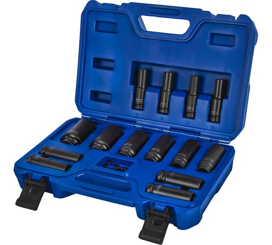 Набор головок торцевых ударных глубоких выполнен из хром-молибденовой стали. Широко применяется на СТО, в ремонтных и шиномонтажных мастерских. Головки надёжно фиксируются в местах посадки и не выпадут при тряске.Эргономичный и противоударный кейс имеет надёжное петлевое соединение.