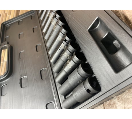 Отличный набор. Самый доступный набор 10-32, дешевле некоторых наборов 10-24. Головка на 27 в наборе есть! Ошибка в описании. Покрытие - не краска, как тут писали, а полноценное оксидирование, всё как надо. В кейсе есть ещё два дополнительных слота под головки или мелочевку. Кейс черный, а не голубой, как на фото. Головки все промасляные пришли, чтоб не ржавели. Отличный доступный набор набор на все размеры сразу, в общем