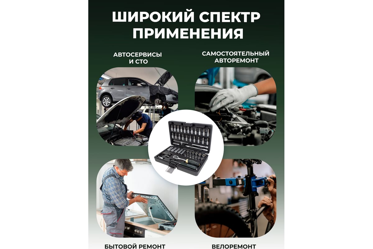 Многопрофильность. Подходит для ремонта легковых и грузовых автомобилей мототехники, квадроциклов, снегоходов, гидроциклов, спецтехники, садовой техники и прочих слесарно-монтажных работ с различным крепежом.