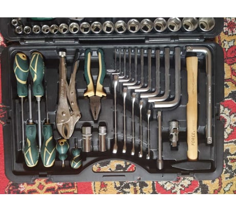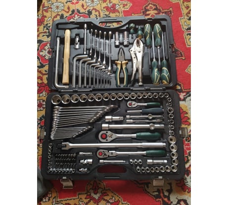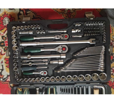 Богатейшая комплектация! Есть все для общеслесарных работ! Очень высокое качество инструмента и внимание к мельчайшим деталям. Кейс четко держит все элементы набора, ничего не болтается. Хорошая фиксация замками. Ключи изготовлены из хорошей стали с устойчивым к повреждениям покрытием- уже пару лет в использовании и каждый ключик до сих пор выглядит почти новым! Трещетки не люфтят, фиксация головок изумительная- все подходит идеально- не болтается и не клинит на квадрате!
