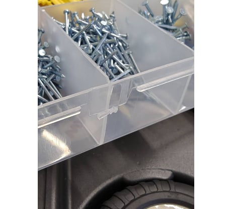 Пришёл со сломанной защёлкой крышки ящика под гвозди и шурупы. Из-за этого гвоздики были и будут разбросаны по всему ящику с инструментами.