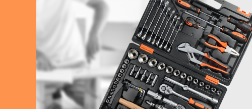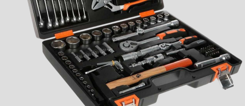 Для слесарных работ в комплекте имеются пассатижи и клещи, а также молоток. Кейс выполнен из пластика, оснащен раздельными петлями и двумя металлическими замками для безопасной транспортировки.
