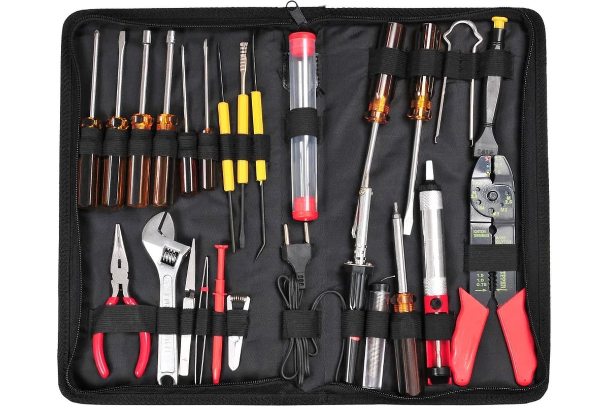 Набор инструментов включает все необходимые мастеру инструменты, причем не только для домашнего использования. Набор найдет спрос и у людей, профессионально занимающихся монтажными работами, - компактный кейс занимает мало место, предоставляя при этом широкий спектр возможностей. Набор инструментов Buro TC-1111 включает в себя несколько видов отверток, 130 мм пассатижи, пару торцевых ключей и один 150 мм разводной. В наличии - прибор разделки кабеля, а также инсертер и экстрактор, полезные при работе с микросхемами. Миниатюрный паяльник поставляется вместе с необходимым припоем. Для статичной работы предусмотрен зажим, зацеп и пара пинцетов.