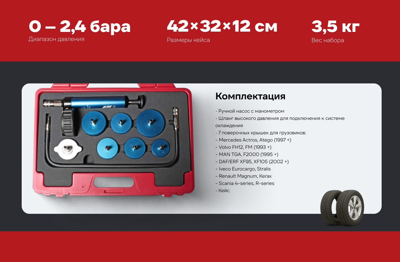 Набор инструментов для тестирования герметичности системы охлаждения (кейс) JTC 4150 используется для поиска утечки в радиаторах грузовых автомобилей Deutz Engine, Mercedes-Benz, Volvo, Man, Renault, DAF, Iveko, Scania. Габариты набора составляют 440х330х100 мм.