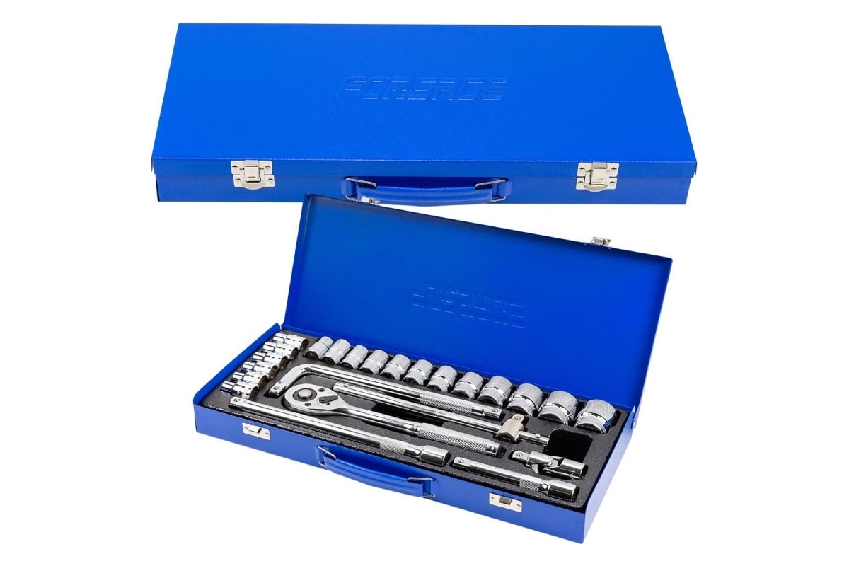 Набор инструментов из 24 предметов от бренда Forsage обеспечивает широкий спектр инструментов для работы с резьбовыми соединениями размером 1/2" и является удобным и компактным в использовании. Он идеально подходит для использования в автомобильных и механических работах. Размеры 45х20х5 см.