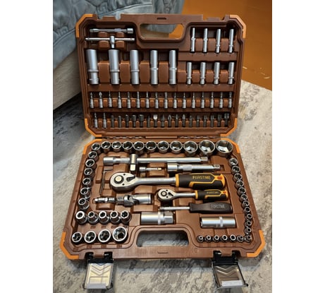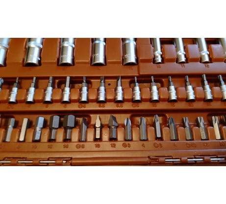 Широкая комплектация. Включает 19 торцевых головок (размерами от 8 до 32 мм) и 12 глубоких головок (размерами от 10 до 24мм), что делает его универсальным для большинства задач по ремонту автомобиля, включая замену свечей и работы с различными креплениями.