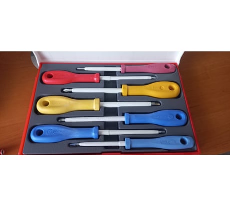 Отвёртки понравились, не катаются за счёт плоских рукояток, все размеры жал которые могут понадобиться. Различие по цветам. Жало крепкое, проверяли тянув клемник со всей пролетарской, не погнулось.