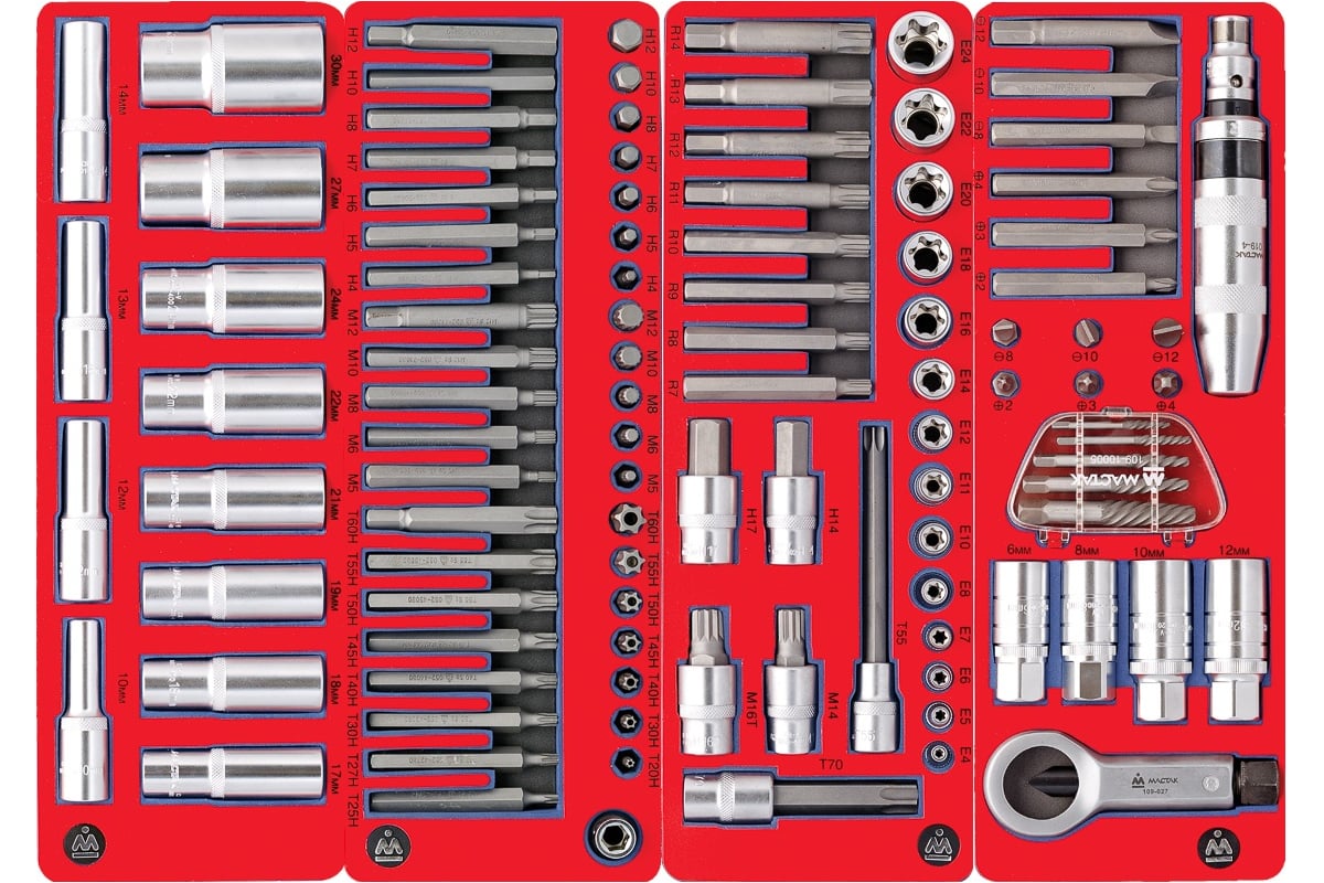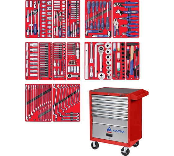 Набор инструментов ПРОФИ в красной тележке, 299 предметов МАСТАК 52-299R - это профессиональные автомобильные приспособления, которые активно используются при ремонте как легкового, так и грузового транспорта. В набор входят 14 ложементов, изготовленных из легкого, и, в то же время, высокопрочного материала, устойчивого к воздействию масел и деформаций (возвращает свою первоначальную форму).
