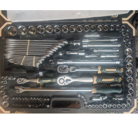 Полный набор для гаража и сервиса. Есть все: от мелких бит до мощных головок. Качество на уровне — грани не срывает, трещотки работают четко. В кейсе порядок — ничего не гремит и не теряется. Пользуюсь полгода — ни один инструмент не подвел. Цена оправдана на 100%.
