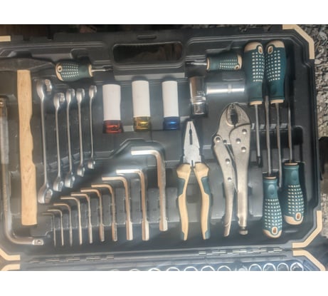 Отличный набор инструментов: много всего, всё под рукой. Кейс прочный, детали не болтаются, лежат на своих местах. Сталь нормальная — с бытовыми и автозадачами справляется. Рукоятки не скользят, работать удобно. За свою цену — то, что нужно для домашней мастерской или гаража.