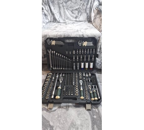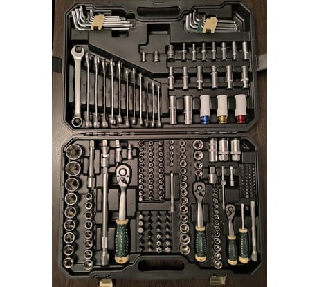 Полный набор для гаража и сервиса. Есть все: от мелких бит до мощных головок. Качество на уровне — грани не срывает, трещотки работают четко. В кейсе порядок — ничего не гремит и не теряется. Пользуюсь полгода — ни один инструмент не подвел. Цена оправдана на 100%.