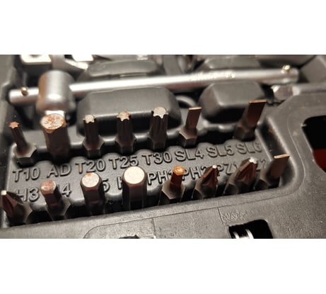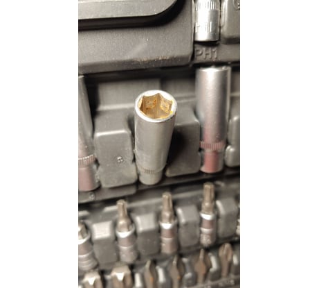 Набор красивый. Выбирал между 94 и 108. Главное отличие – здесь нет гибкого удлинителя на 1/4, зато больше головок-бит. Все красиво и аккуратно, набор укомплектован без ошибок и повторов, все в коробке подписано, на блестящих частях фирменный знак, размер и CrV. Все, что пробовал, хорошо надевается и снимается. Но все биты в левом верхнем углу на фото вообще не держатся на своих местах в коробке и выпадают при любом движении и дыхании на них. Также надо открывать только крышку с надписью, иначе все головки вывалятся. В крышке все держится великолепно. Думаю, существенные усилия прилагать не следует. Для начинающего автолюбителя рекомендовал бы другой набор этого производителя на 74 входящих. Там есть только то, что наверняка понадобится. Добавив переходники, удлинители (от Дела Техники) и шестигранники, получите полный комплект инструментов первой необходимости, уложившись в 5 тыс. руб. Спросите, зачем шестигранники? Мне они понадобились, чтобы подтянуть крепление салонного зеркала. В тот момент у меня их не было с собой и зеркало очень дрожало.