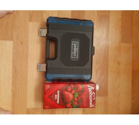 Несмотря на размер кейса( на фото с 2 литровым соком сравнил) ,очень увесистый набор и занимает очень мало места, как то получилось все разместить очень грамотно , удив механизмы переходников для бит разных( внутри них стоит скоба она фиксирует биты, их нужно сильнея внутрь вдавливать и тогда они держаться хорошо).трещетка тяжолая, инструмент похож на профисиональный но мини.пока не пробывал им работать.для дома самое то и в машине по мелочи покрутить.