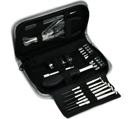 Набор состоит из 24 предметов: биты – 10 шт, PH: 1, 2, SL: 2, 5, 6, PZ: 1, 2, T: 10, 15, 20,пинцет – 1 шт,плоскогубцы удлиненные – 1 шт,отвертка для бит – 1 шт,торцевые головки ¼ – 4 шт, 5, 6, 8, 10 мм, удлинитель для бит – 1 шт,отвертки для точных работ – 6 шт