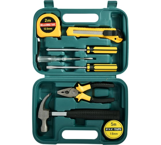 Набор состоит из 8 предметов:рулетка – 1 шт,нож канцелярский с лезвием – 1 шт,отвертка крестовая – 1 шт,отвертка плоская – 1 шт,отвертка плоская тестовая – 1 шт,плоскогубцы – 1 шт,молоток с гвоздодером – 1 шт,изолента – 1 шт.Изготовлено: сталь, пластмасса (полипропилен). Размер футляра для хранения 23,5х17х4,5 см.