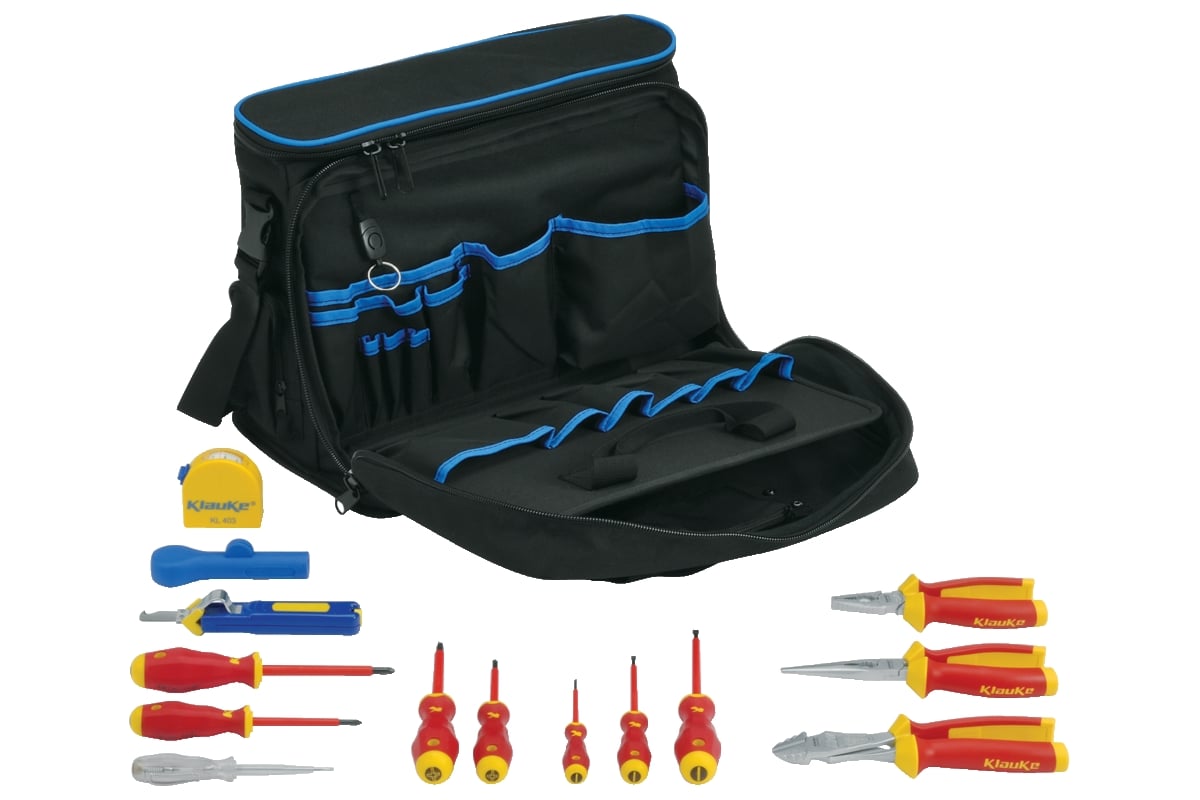 Набор инструментов в профессиональной сумке Klauke klkKL905B15 универсален для любых монтажных работ. Состоит из стриппера, рулетки, 11 инструментов, обладающих диэлектрическим покрытием, что позволяет использовать их под напряжением до 1000 В. В сумке предусмотрено множество карманов и отделение для ноутбука. Сумка изготовлена из прочного нейлона. Дно сумки защищено от брызг.