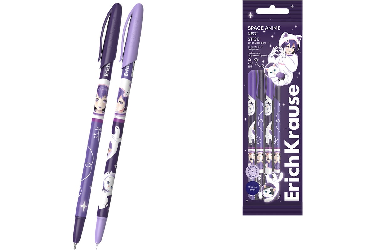 Набор из 4 ручек шариковых ErichKrause Neo Stick Space Anime 0.7, Super Glide Technology, цвет чернил синий (в пакете) 61015