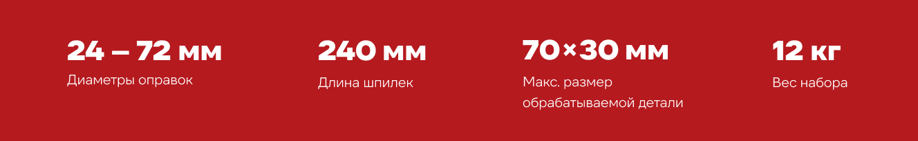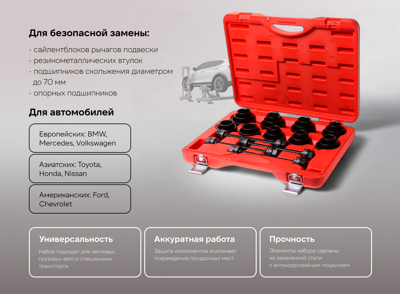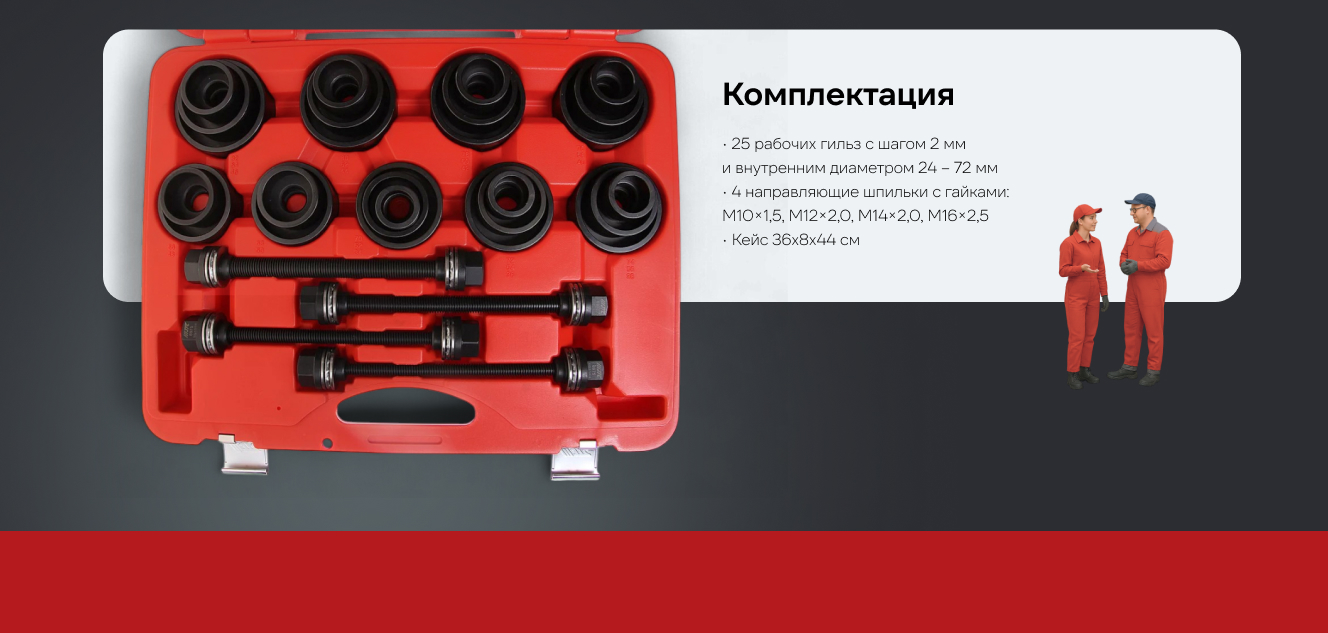 Общее количество предметов в наборе: 29 ед. Гильзы: внутренний диаметр 24-72 мм (с шагом 2 мм) — 25 шт. Направляющие шпильки с гайками: М10, М12, М14, М16, длина: 240 мм — 4 шт. Подходит для большинства автомобилей.