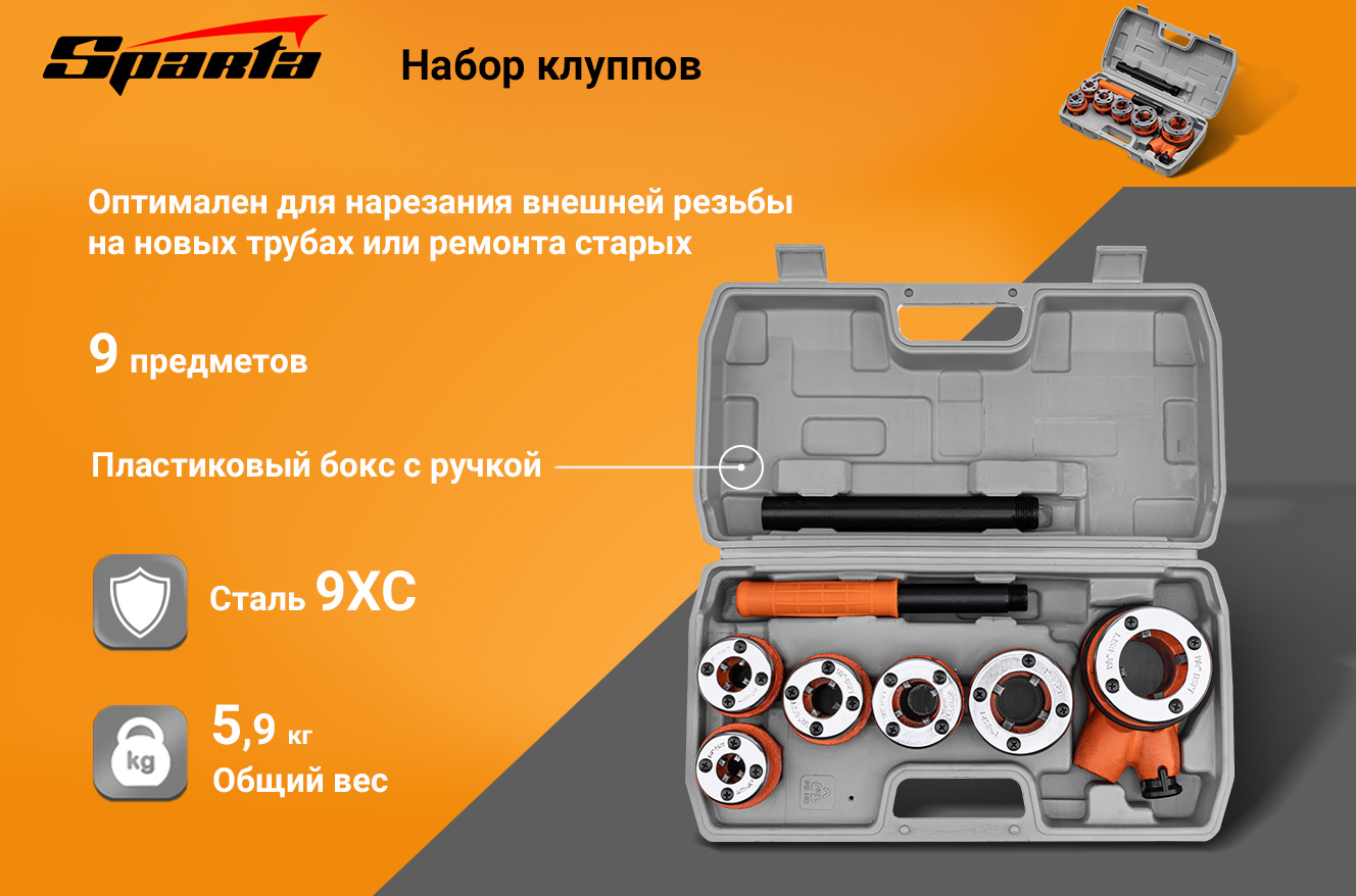 Набор клуппов 9 предметов SPARTA 773355 состоит из трубных клуппов, плашкодержателя с трещоткой и сборной рукоятки. Применяется для быстрого нарезания дюймовой конической резьбы на трубах в любом, даже труднодоступном месте. Все предметы изготовлены из прочных материалов и уложены в пластмассовый кейс, что способствует удобству хранения и транспортировки.
