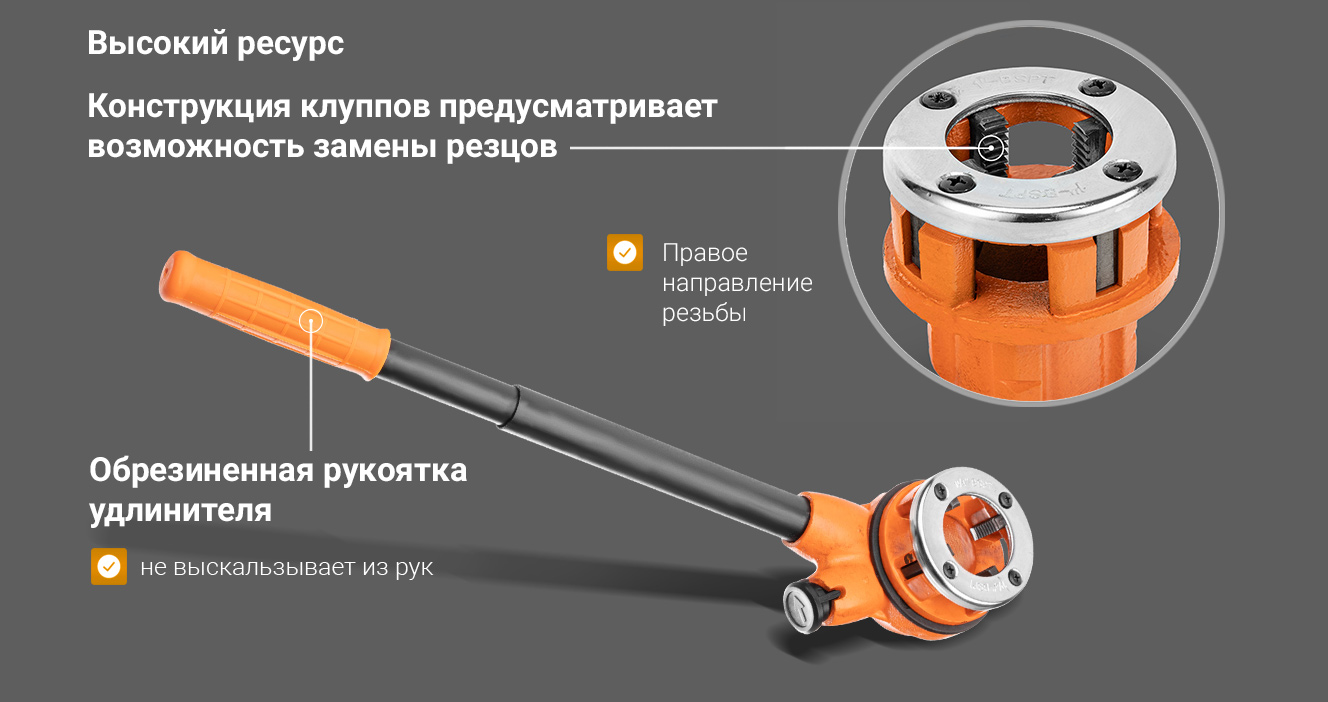 Минимум усилий Плашкодержатель с трещоткой способствуют снижению усилия, которое прикладывается при работе. |