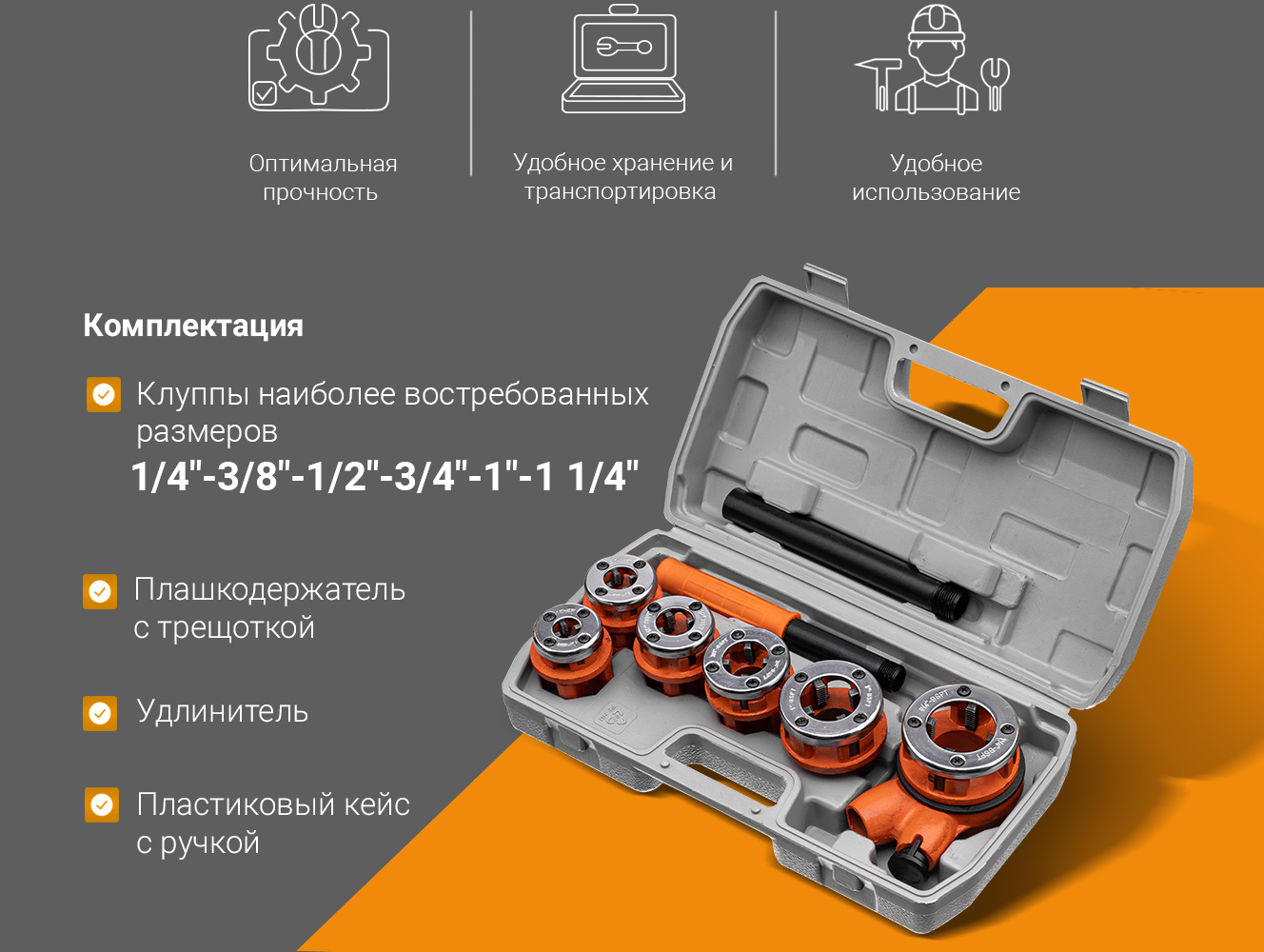 Набор клуппов SPARTA 1/4"-3/8"-1/2"-3/4"-1"-1,25" + плашкодержатель с трещоткой, 9 предметов 773355