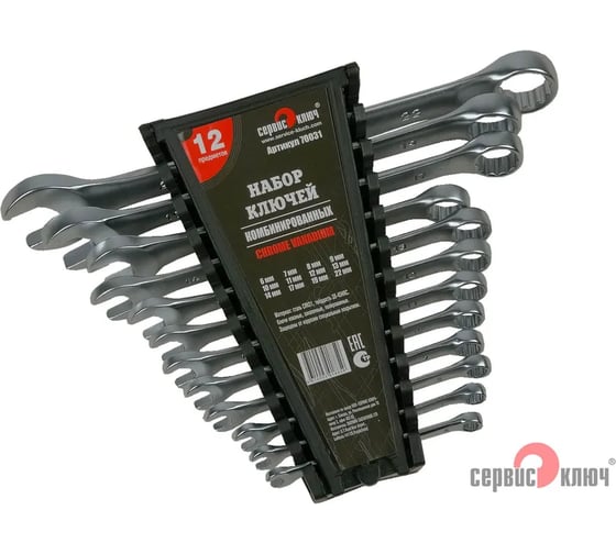Набор комбинированных ключей СЕРВИС КЛЮЧ (12 предметов) – это универсальный комплект ключей, которые подходят для работы с шестигранным крепежом разных размеров. Удобство этого ключа в том, что с одной стороны ключа – стандартный открытый захват (рожковый), с другой – кольцевой (накидной), который имеет 12 граней для улучшения захвата при работе с «трудным» крепежом. Инструмент широко используется в быту, в промышленной и автомобильной сфере.
