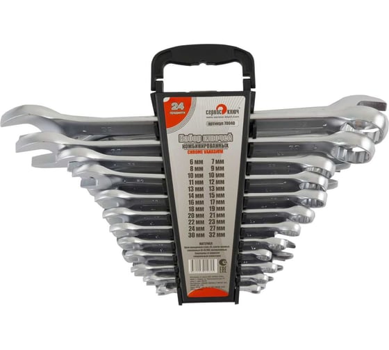 Набор комбинированных ключей СЕРВИС КЛЮЧ PROFFI (24 предмета) – это универсальный комплект ключей, которые подходят для работы с шестигранным крепежом разных размеров. Удобство этого ключа в том, что с одной стороны ключа – стандартный открытый захват (рожковый), с другой – кольцевой (накидной), который имеет 12 граней для улучшения захвата при работе с «трудным» крепежом. Инструмент широко используется в быту, в промышленной и автомобильной сфере.