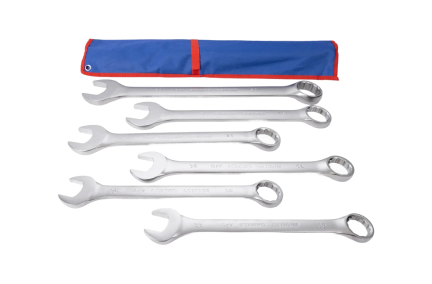 Финишная обработка Satint и хром никелевое покрытие комбинированного ключа обеспечивает надежную защиту от коррозии, а также надежный хват и препятствует выскальзыванию инструмента из рук. 12-гранный профиль накидной части подходит к головкам болтов и гайкам как 6-, так и 12-гранного профиля, и обеспечивает 5 градусный шаг перехвата. Специальный отгиб, в 15 градусов накидной части ключа позволит работать в местах с ограниченным доступом к крепежу и помогут подобраться к крепежу как с торца, так и с боку, в зависимости от места выполняемых работ. Ключи размещены в удобном чехле из ПВХ ткани оксфорд плотностью 1000 гр/м, размер в раскрытом виде 680х550х15 мм, каждое место размещения инструмента промаркировано, что обеспечивает простоту подбора необходимого ключа.