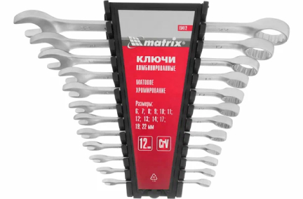 Набор комбинированных ключей 6 - 22 мм MATRIX 15412 состоит из двенадцати ключей, изготовленных из штампованной хромванадиевой стали с матовым хромоникелевым покрытием, что обеспечивает продолжительный срок службы. Набор поставляется со специальным держателем для удобного хранения ключей.