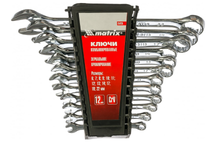 Набор комбинированных ключей MATRIX 15426 из стали CrV, размером 6-22 мм, с покрытием «полированный хром» предназначен для монтажа демонтажа шестигранных резьбовых соединений. Для удобства хранения набор поставляется в комплекте с трапециевидным пластмассовым держателем. Все ключи изготовлены из хромованадиевой стали и обладают высокой прочностью и долговечностью. В набор входят инструменты основных типоразмеров, позволяющие эффективно решать поставленные задачи