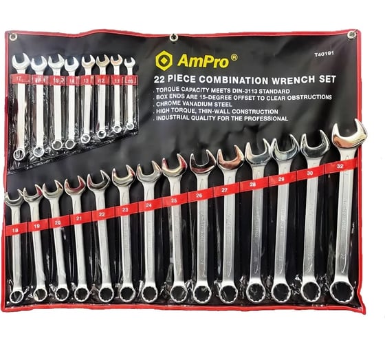Набор комбинированных ключей AmPro 22 предмета 10-32 мм T40191 упрощает работу с крепежом. Благодаря прочной стали инструмент выдерживает значительную нагрузку - можно вращать тугой крепеж.