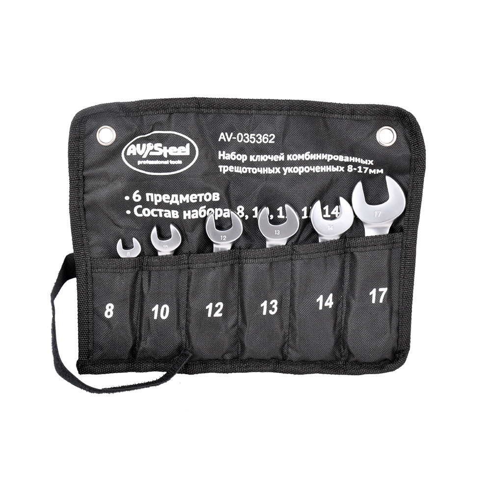 - Долгий срок службы AV Steel трещоточные, укороченные, 8-17мм 6 шт, в сумке AV-035362.