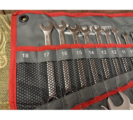 Набор комбинированных ключей из 14 предметов на полотне от бренда Forcekraft — это универсальный инструмент, который сочетает в себе рожковый и накидной профили. Он идеально подходит для работы в труднодоступных местах и обеспечивает надежную фиксацию крепежа.