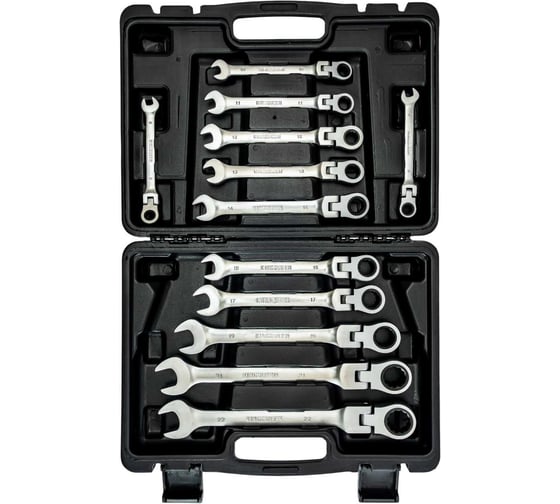 Ключи комбинированные со встроенной трещоткой и шарниром в кейсе обычно представляют собой набор ключей разных размеров, каждый из которых имеет встроенную трещотку и шарнир. Ключи сделаны из хромованадиевой стали и имеют хромоникелевое покрытие для дополнительной защиты от коррозии.